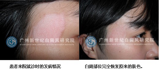 病症:患者白斑分布在额头部位,患者发现了白斑就去了医院就诊。经过详细的诊断后,发现患者黑素细胞缺失,病情稳定,确诊为散发型白癜风初发期。