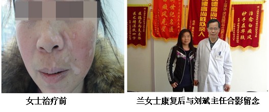 刘医生根据兰女士的病情,采用“多维白癜风康复工程”,即采用当前医学界先进的“美国308激光治疗仪”,同时配合中西药治疗,一 个月内总共通过6次光疗、二个疗程服药,取得了明显的效果:兰女士脸部的白癜风大块的缩小,小块的消失,并且都出现了黑色素生长的迹象——“黑色素岛”, 经过一段皮肤自我修复,这些黑色素岛就会全部褪去,还原健康肤色。