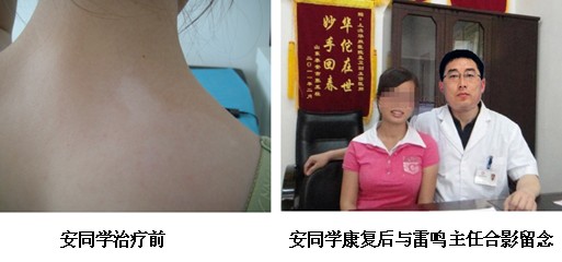 治疗仅用半个月,就收到了明显的效果。现在,安同学后颈和背部的白斑已经消失,虽然新生的皮肤有点发黑,但不久就会恢复正常肤色。安同学祛除 “心头之患”后非常开心,这个曾经的悲观女孩,说起自己的治病过程热泪盈眶,她感谢雷鸣医生让自己重新看到了人生希望,她把雷鸣比作自己的再生父母,说雷医生为她看病如同“爸爸”一样亲切和放心。在线查看☆☆☆更多白癜风康复案例☆☆☆