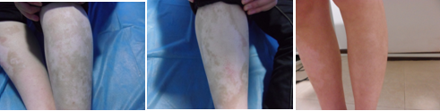 (3)盘状红斑狼疮:特别发于面颊及唇部的盘状红斑狼疮,当治愈后常遗留下界限清楚之暖色素性斑片,面似白癜风,但是此暖色斑总有些萎缩及毛细血管扩张,有时尚可发现粘着性鳞屑,及其下扩大的毛囊口与角质栓。