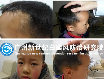 现病史:患者家属于5月前发现患者右额部白班,到华西医院治疗两月外用他克莫司搽药,未见好转,又到当地医院照光治疗,今来广州新世纪白癜风防治研究院。