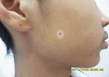 主诉:右侧面颊部有白斑 病症:患者患白癜风有4个多月,刚开始隐约出现小白点,之后扩散成黄豆大小,期间采用过外用药进行治疗,但效果不明显。近来发现白斑逐渐扩散,特来我院就诊。 检查:1、微量元素:铜离子低下 2、微循环:轻度异常 3、伍德灯:右侧面颊部有一晕痣型白斑,约1-2cm左右,黑色素脱失87%左右 4、自体免疫系统检查:轻度异常 诊断:局限型白癜风(发展期) 治疗:医生首先采用“白癜风CT检查”、“德国奥曼wood灯检查”等多项检查为患者做了详细全面的确诊,在确定具体的病症情况下,根据科学的诊断结果,医生为其进行了“多维白癜风康复工程”,以“黑色素细胞培植术”为核心治疗技术。治疗一个月不到的时间,白斑部位内有大量黑色素生成,白斑逐渐减淡。经过3个月的治疗后该患者已经完全康复。 |