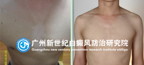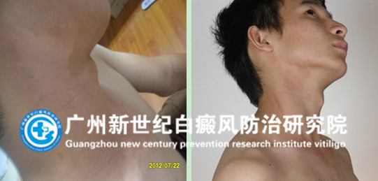 刘凯(化名)是一名高二学生,6年前被其母亲发现后背出现小白斑。没过多长时间,白斑扩散开,去当地医院检查,被确诊为白癜风。但刘凯和家人没有接受医院的治疗,所以,这6年里,刘凯身上的白斑没有接受过任何治疗。后白斑扩散到颈部、胸前及手臂,白斑面积增大,身上其他地方也相继出现白斑症状,恐其继续扩散,刘凯在家人的陪同下来到了广州新世纪白癜风防治研究院。
