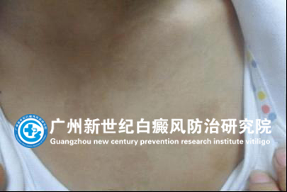 (治疗4个月后,患者右侧锁骨处的白斑已完全消失,黑色素生长良好)