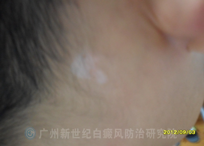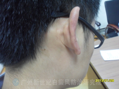23 的陈同学是一名大学在校生,一周前,陈同学发现自己的右耳侧出现了小快的白斑,皮肤周围也有零星的小白点,陈同学的父母见状,立刻带他去了当地的医院查 看,确诊为白癜风,为了不耽搁病情,进行进一步的确诊,在其母亲同事的推荐下来到了广州新世纪白癜风防治研究院,通过梁京峰医生的详细检查,发现陈同学的右 耳侧及身体的其它部位均有白癜风症状,确诊为泛发型白癜风,脸部及肩膀处有隐性白斑,如果不及时治疗,白斑处的黑色素会继续脱失,病情会加重,梁京峰医生医 师根据陈同学的具体情况,对其病情制定了针对性的治疗,让陈同学接受了“蓝氧自体免疫激活祛白疗法”,主要以“美国新一代308nm准分子光 ”为核心治疗技术,辅以微量元素的补充。治疗一个月不到,陈美德右耳侧的白斑已经明显减淡,黑色素大量生成,并生长良好,治疗4个月后,陈同学右耳侧的白 斑已经完全消失,并进入稳定的康复期。