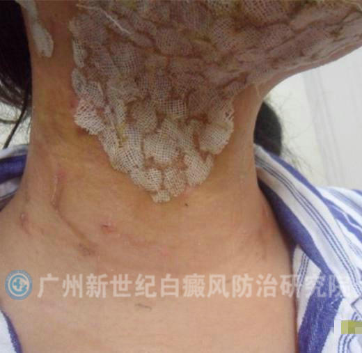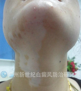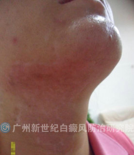 ▲病史:患者于两年前右侧颈部无明显诱因出现白斑,曾于珠海中医院治疗,外用(复方卡力孜然酊)、中药煎服、光疗,治疗后效果不佳,今来我院就诊。