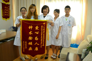 治疗3个月后,到院复诊,检查结果显示梁小姐胫骨、后背、手臂处的黑色素生长状况良好,患处的皮肤已经与正常肤色无异,处在稳步的康复阶段。见皮肤恢复良好,她不胜欣喜给医院的周华玲医生送来锦旗,以表达自己的感激之情。