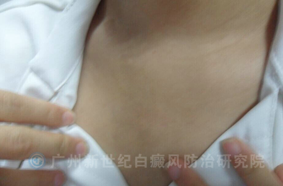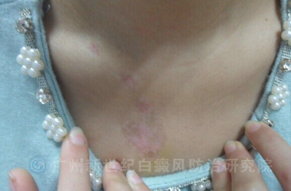 一年多前,梁小姐下班后回家照镜子时发现前胸多了几个白点,当时她没多留意,不想没几个月白点已经长成白斑,随后发现两侧手臂和后背都有类似的白斑,大小不一。这才意识到问题的严重性,当即到附近一家综合医院进行治疗,但效果不显著。恰巧她在网上看见广州新世纪白癜风防治研究院采用“蓝氧自体免疫激活祛白疗法”,于是到院就诊。
