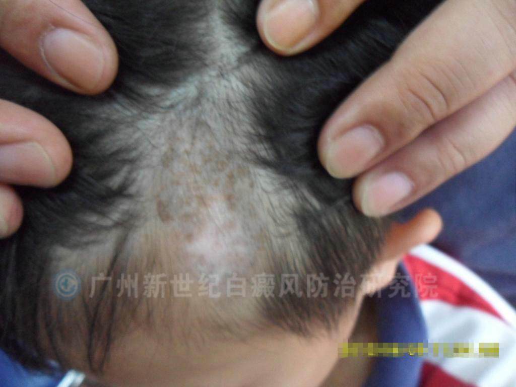 (患者初诊时,左头部的白斑症状)