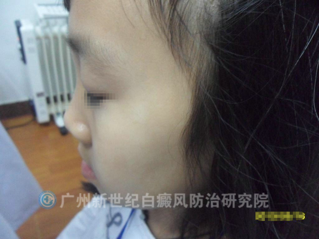 患者侧脸有一块小白斑,白斑颜色较白,边缘界线清晰,并且白斑边缘色素在加深,经白癜风检测仪——伍德灯的检查,处于白癜风稳定期。通过微量元素检查显示,患者微量元素铜远远低于正常值,从而使黑色素形成受到阻碍,无法形成。结合患者白斑症状及检查情况,医生采用了“美国新一代308nm准分子光治疗系统”,并提醒患者头部应避免接触洗发露,以免造成白癜风复发,扰乱治疗效果。在患者的积极配合下,治疗两个月后,患者手部白斑已明显不见了。三个半月后患处皮肤转为正常肤色。