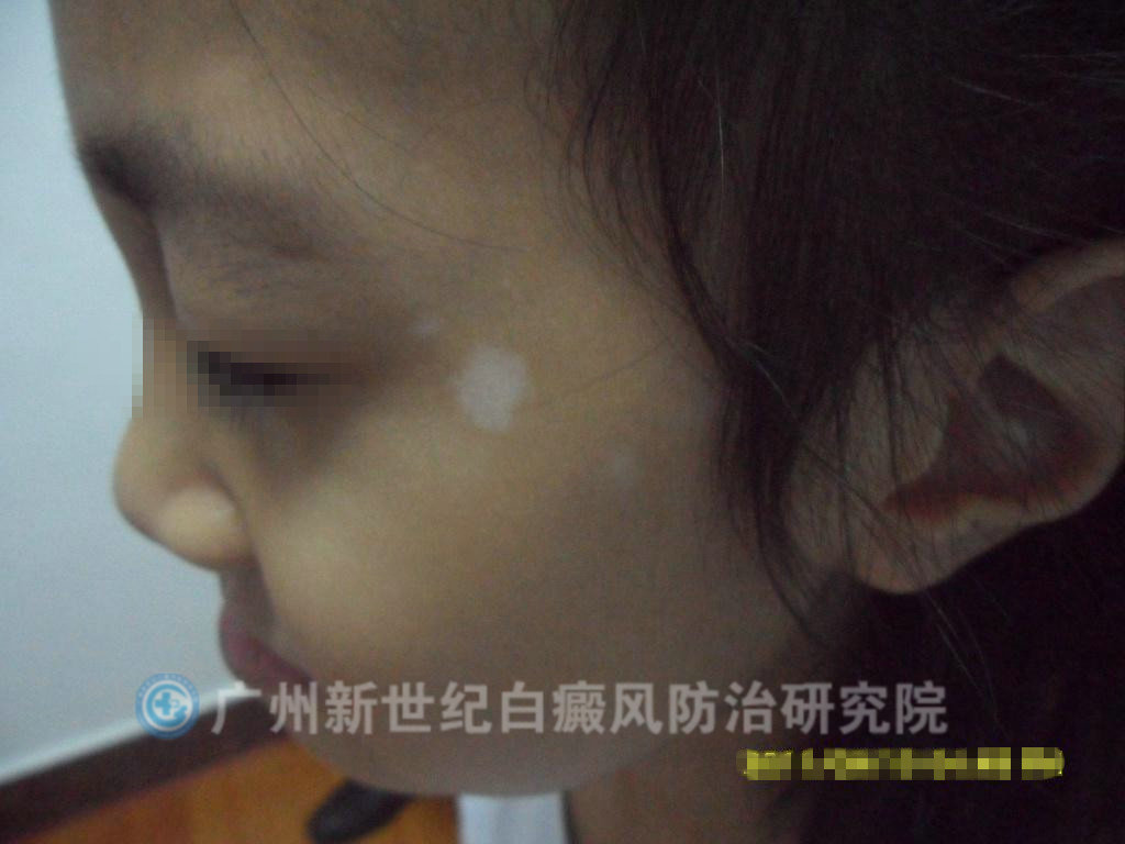 ▲病史:据患者介绍,患者自小体弱多病,免疫力低下、经常感冒、有轻微甲亢。自8岁时脸部出现黄豆般大白斑,开始家人并未重视,后来发现额头及耳根部位也出现白斑,而且范围逐渐扩大,起初使用药膏涂抹,但是并未消除白斑,反而越来越严重,遂到医院就诊。