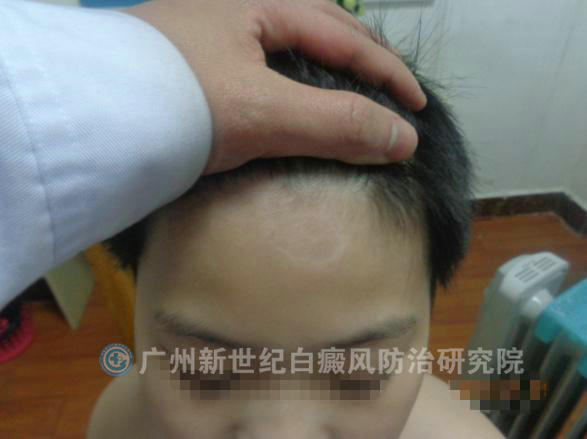 ▲病史:患者于4年前无明显诱因发现额头出现白斑,曾在深圳某医院治疗,采用口服药(药名不详)、外用药(药名不详)治疗后,效果不佳,对饮食、作息时间等方面也未能引起重视,恐其继续发展,故今日特来我院就诊。