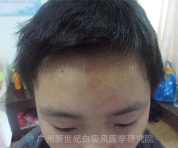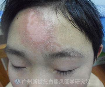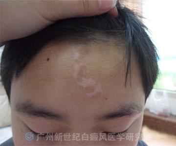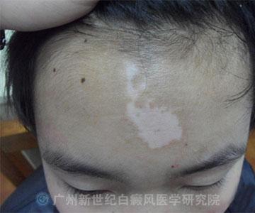 现病史:患者于1年前无明显诱因前额出现小片状浅白斑,后扩大、增多,现前额、左眉、后背部均见片状浅、瓷白斑,外院治疗效果不佳,今日特来我院就诊。