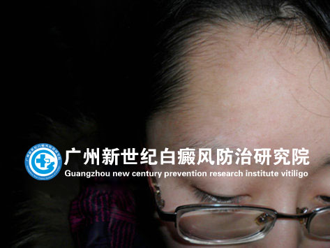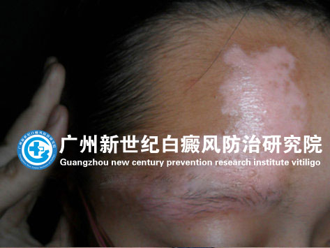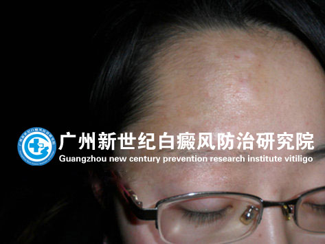 治疗时间:2010年9月23日 检查;患者于一个月前病情加速扩散,白癜风症状遍布眼角、额头,界限清楚,有西药治疗史。