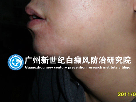 治疗前,李某某下颚至颈部白斑明显。 “新世纪多维白癜风康复体系”疗效显著 |
