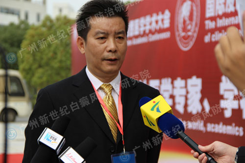 图:广州新世纪白癜风防治研究院梁京峰教授荣获“皮肤健康卫生”荣誉称号后接受广州卫视、人民网等媒体专访