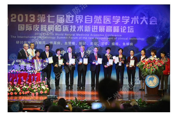 (图:广州新世纪白癜风防治研究院医生梁京峰教授被授予第七届世界自然医学学术大会皮肤病“皮肤健康卫士”,左四为梁京峰教授)