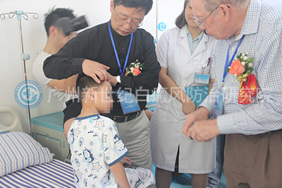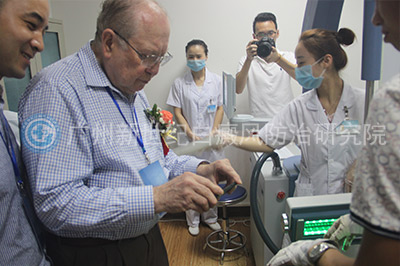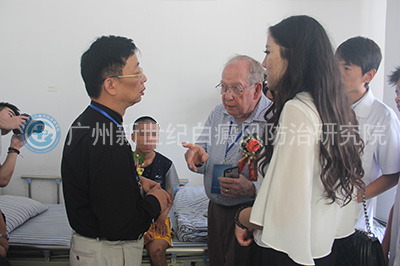 孟中平教授和伯纳德·葛菲教授曾多次联合参加会诊活动,他们来院后首先一起观察了住院治疗的患者的病情恢复状况,并对治疗方案提出了新的改进方法。葛菲教授对白癜风儿童的病情很是关心,一直用还不太熟练的汉语鼓励白癜风患儿:“加油!”孟中平一边安抚患儿情绪,一边仔细观察病情,和葛菲教授一起为患者诊疗。