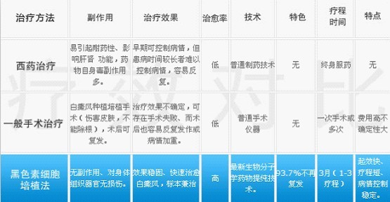 优势二、疗程短,见效快。白癜风区黑色素细胞立即成活,7-10天可见黑色素细胞分裂、繁殖, 1-3个月可出现白癜风区自我养护黑色素细胞功能。加之医生手术操作熟练、轻巧、简捷,大大缩短了手术时间。