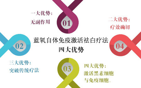 “蓝氧自体免疫激活祛白疗法”属于新一代白癜风治疗方法的先进技术,其通过细胞学和免疫学研究,对人体DNA、RNA直接作用,解决了传统疗法的疗程、复发等问题,其主要优势表现在四大优势上。