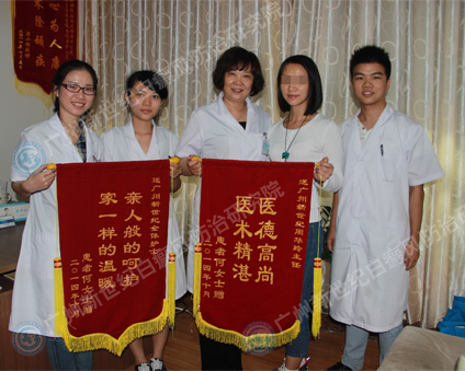 2014年10月,一位患者来到广州新世纪白癜风防治研究院,亲自向主治医生周华玲医生和医护人员献上了锦旗。何女士今年已经40岁了,岁月已经悄然在她脸上留下了条条痕迹,但是,她却依然微笑着面对时间的挑战。她喜不自禁,不停地对着周医生说,太感谢您了,您真是我的恩人之类的感激话语。是什么让她如此激动?让我们跟随记者的脚步探寻事实的真相。