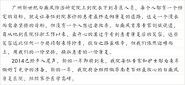 2014步入尾声,这一年,广州新世纪白癜风防治研究院的全体员工都奋战在一线,所有人都在为白癜风患者的康复在忙碌。回首2014年,我院共接收来自国内外白癜风患者共计13475名,平均每天都有37个患者到我院就诊治疗,通过医院专家和患者直接的配合,近12000名白癜风患者已经康复,其余的均在恢复之中,他们都是2014的幸运儿,只要方法正确,下一个康复的就是你。
